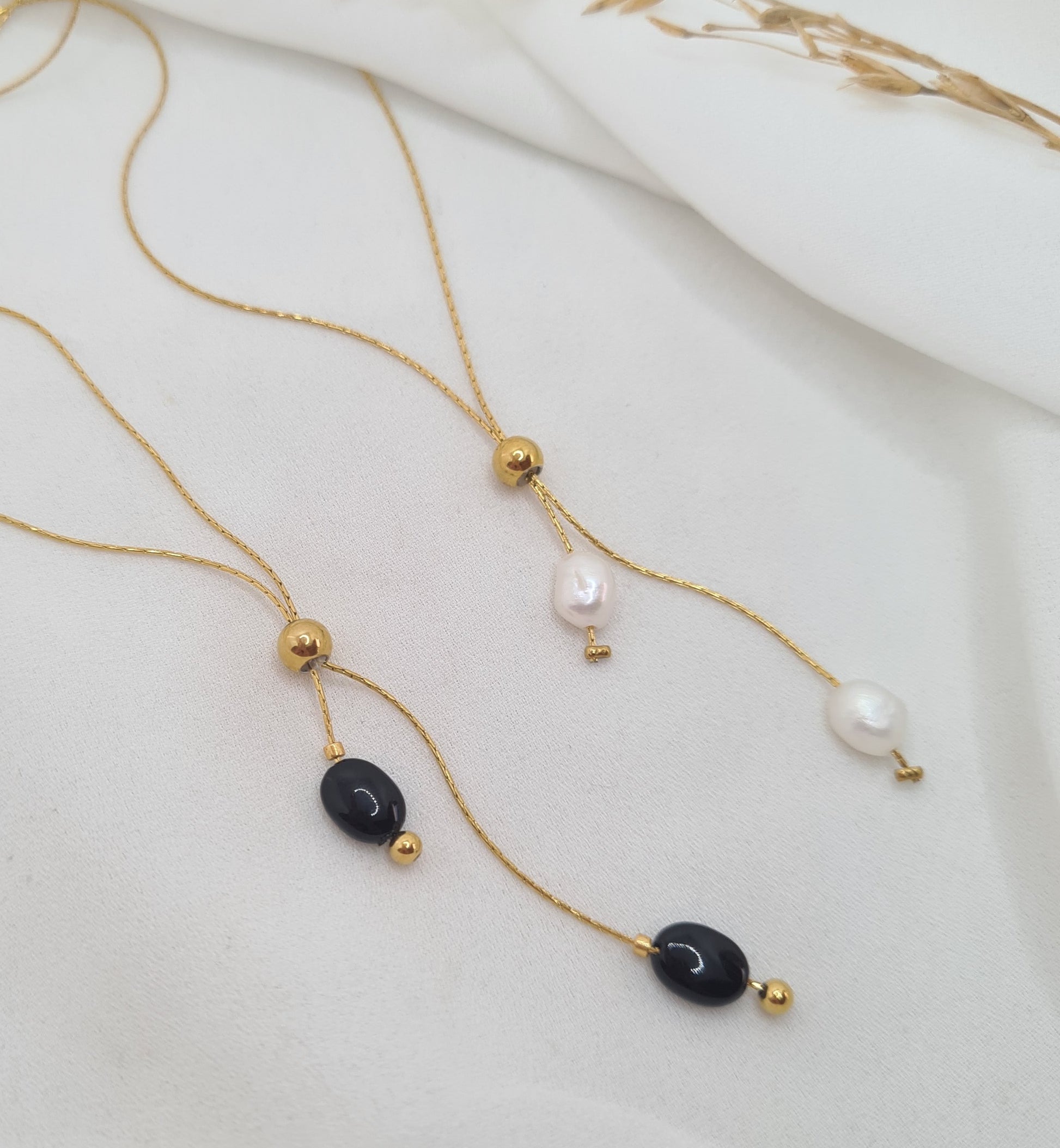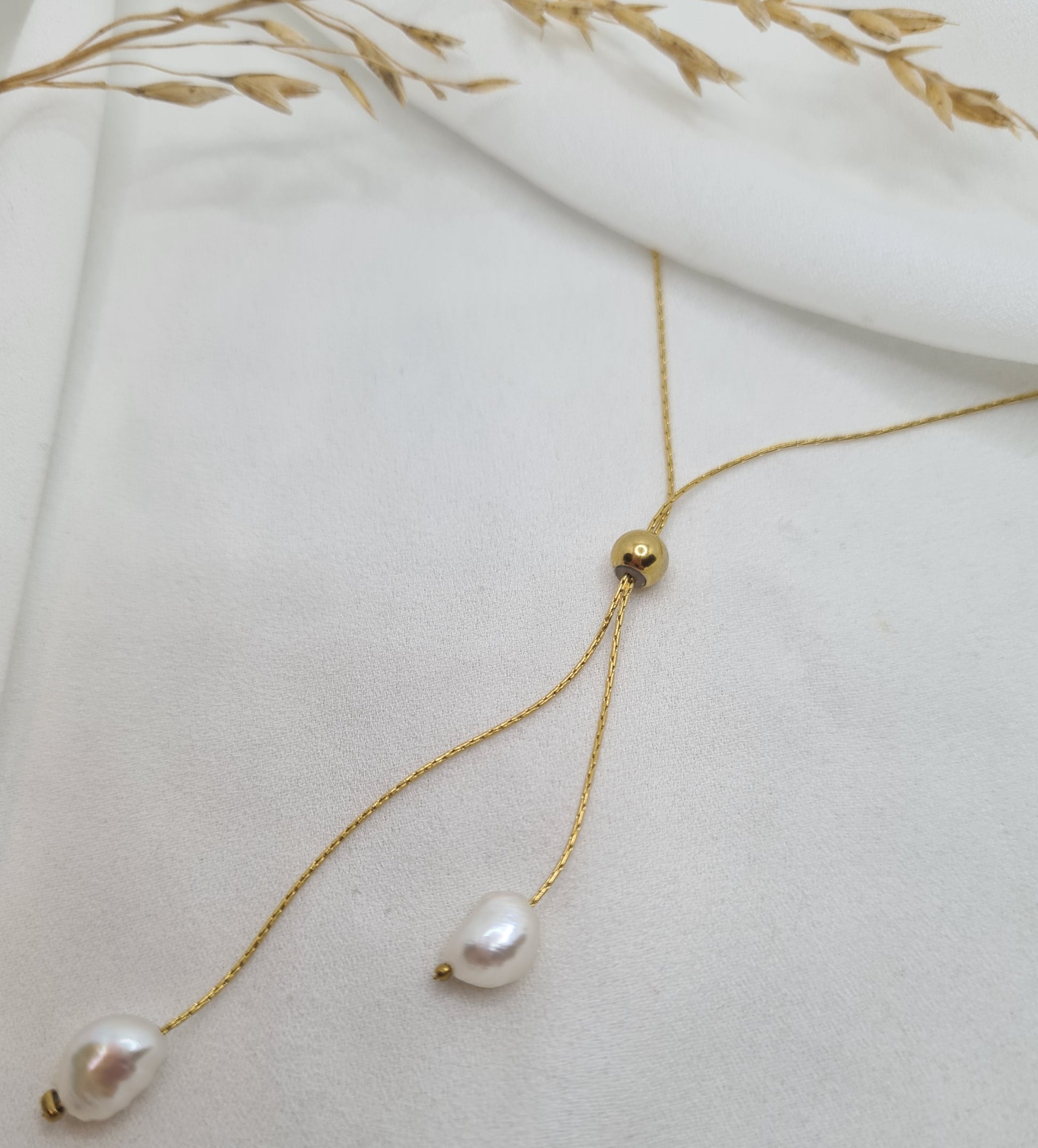 Sautoir réglable grâce au coulissement dans la perle dorée.