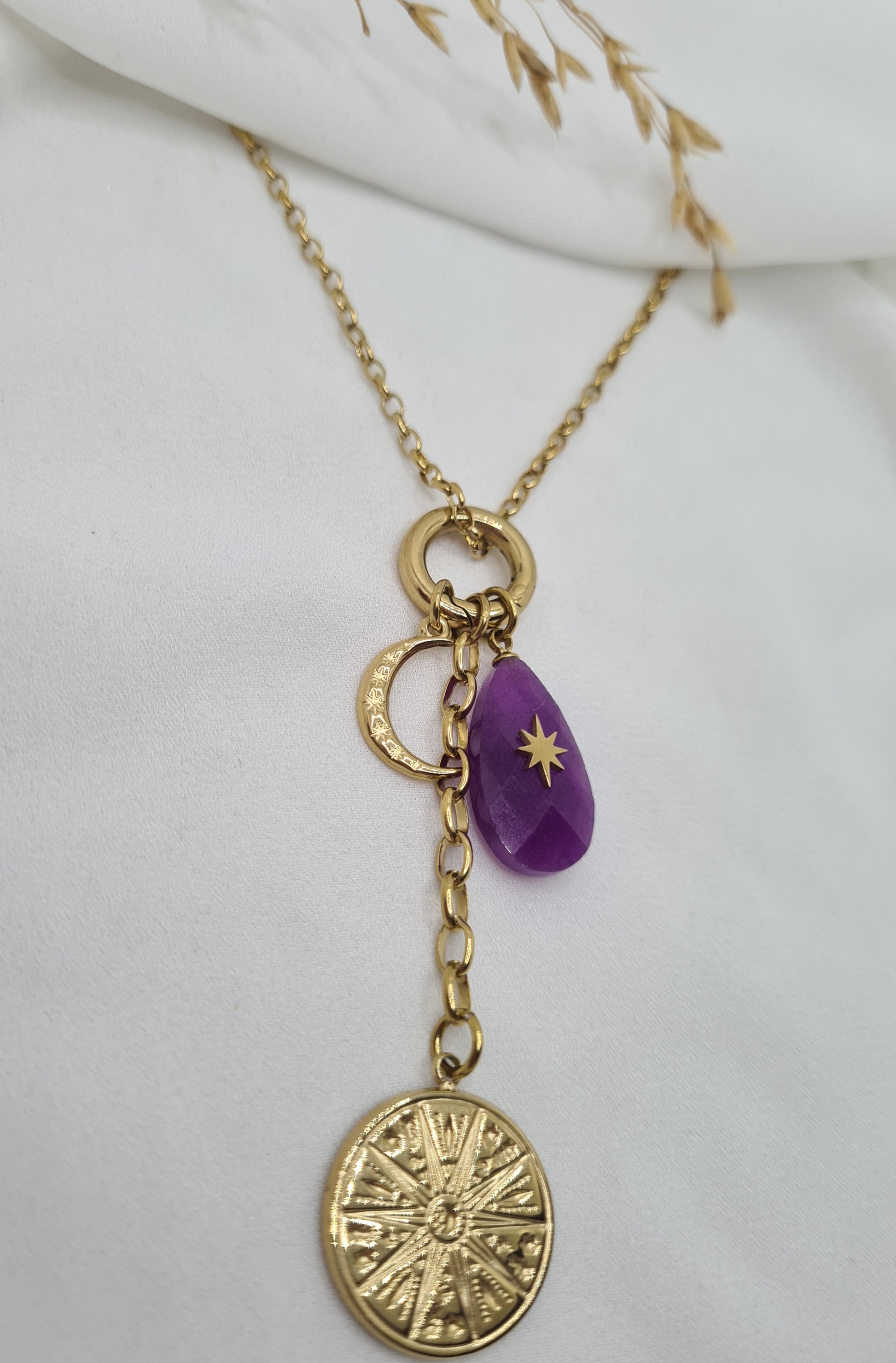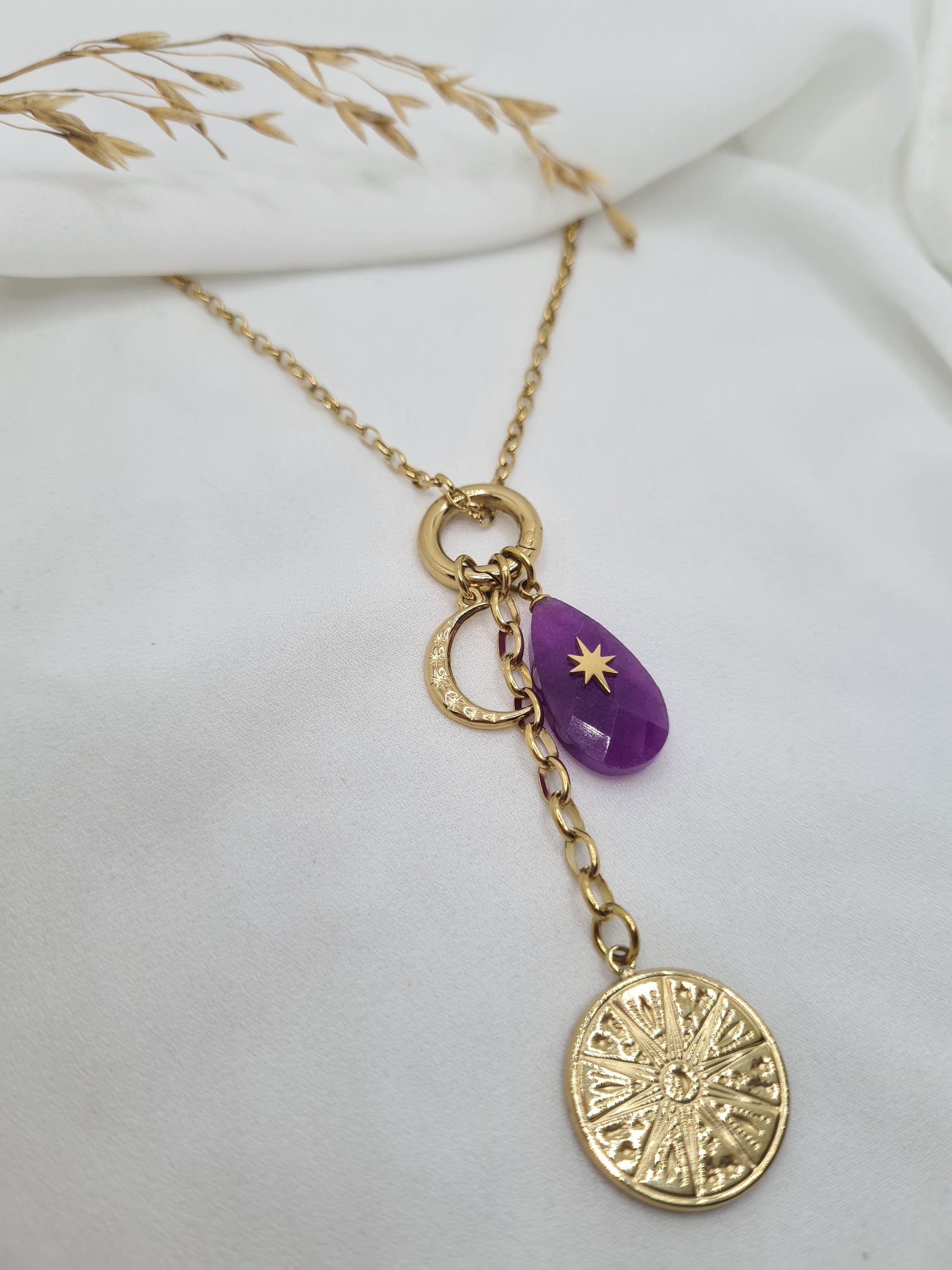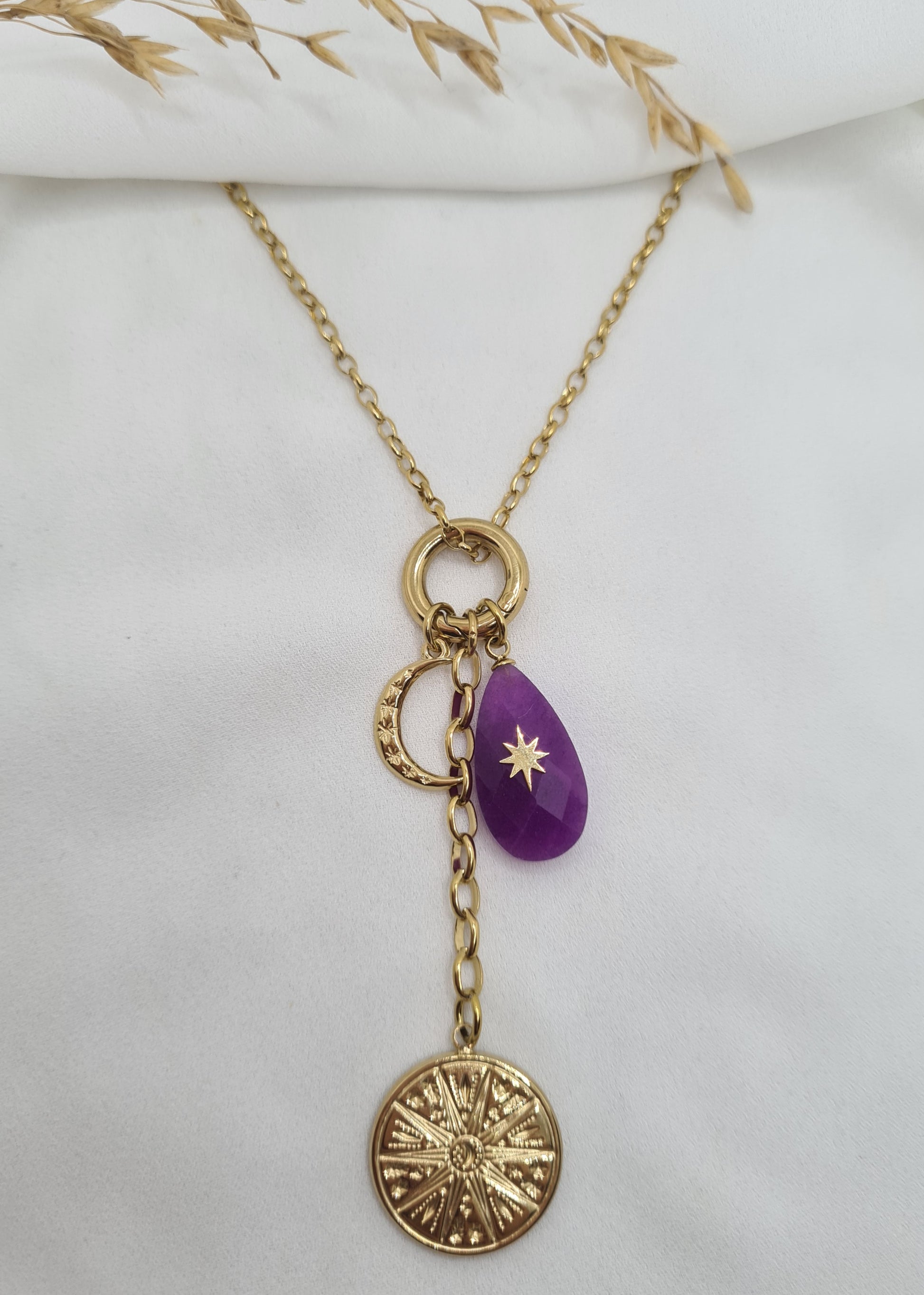 Collier type sautoir en acier inoxydable composé d'un anneau et de divers pendentifs (médaillon galactique, pierre naturelle goutte avec étoile et croissant de lune).