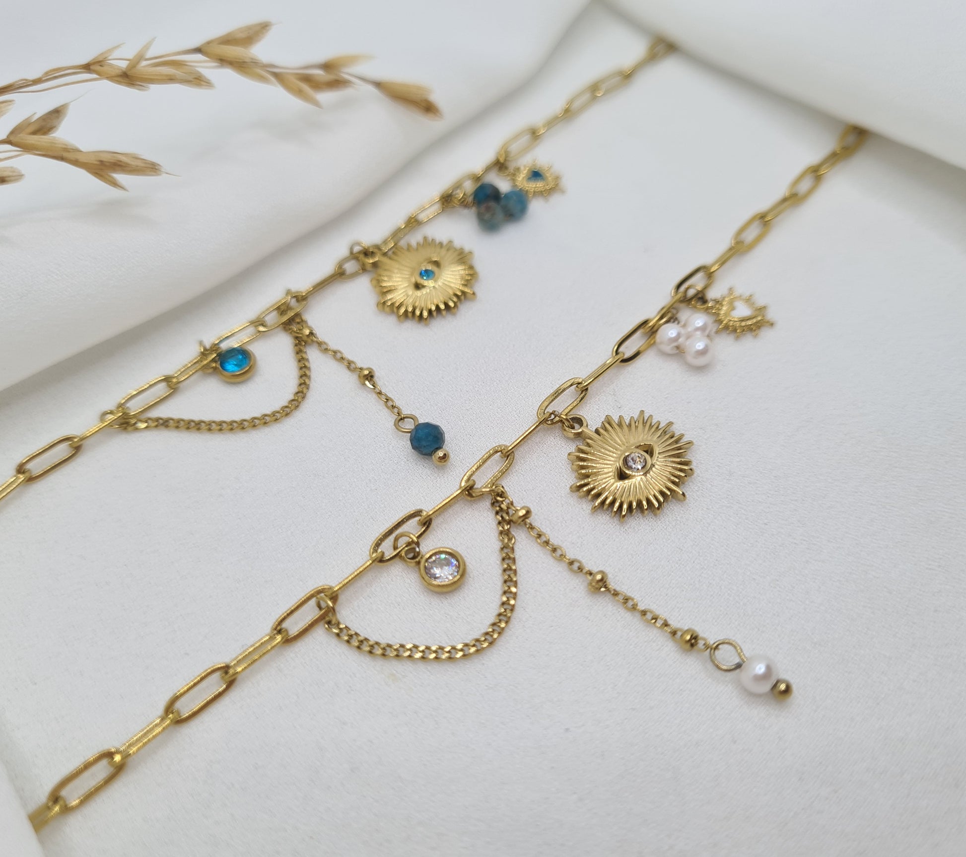 Magnifique bracelet en acier inoxydable et pierres naturelles d'apatite bleue ou de perle d'eau douce