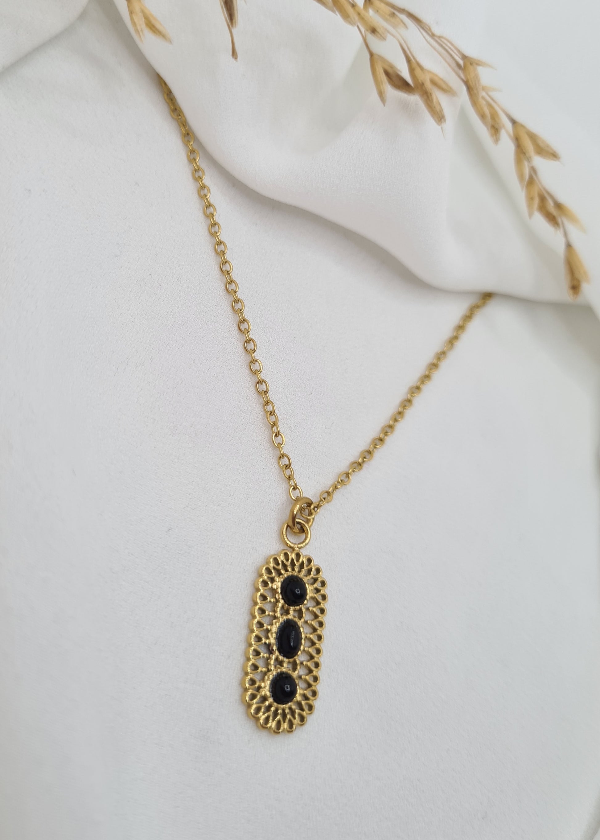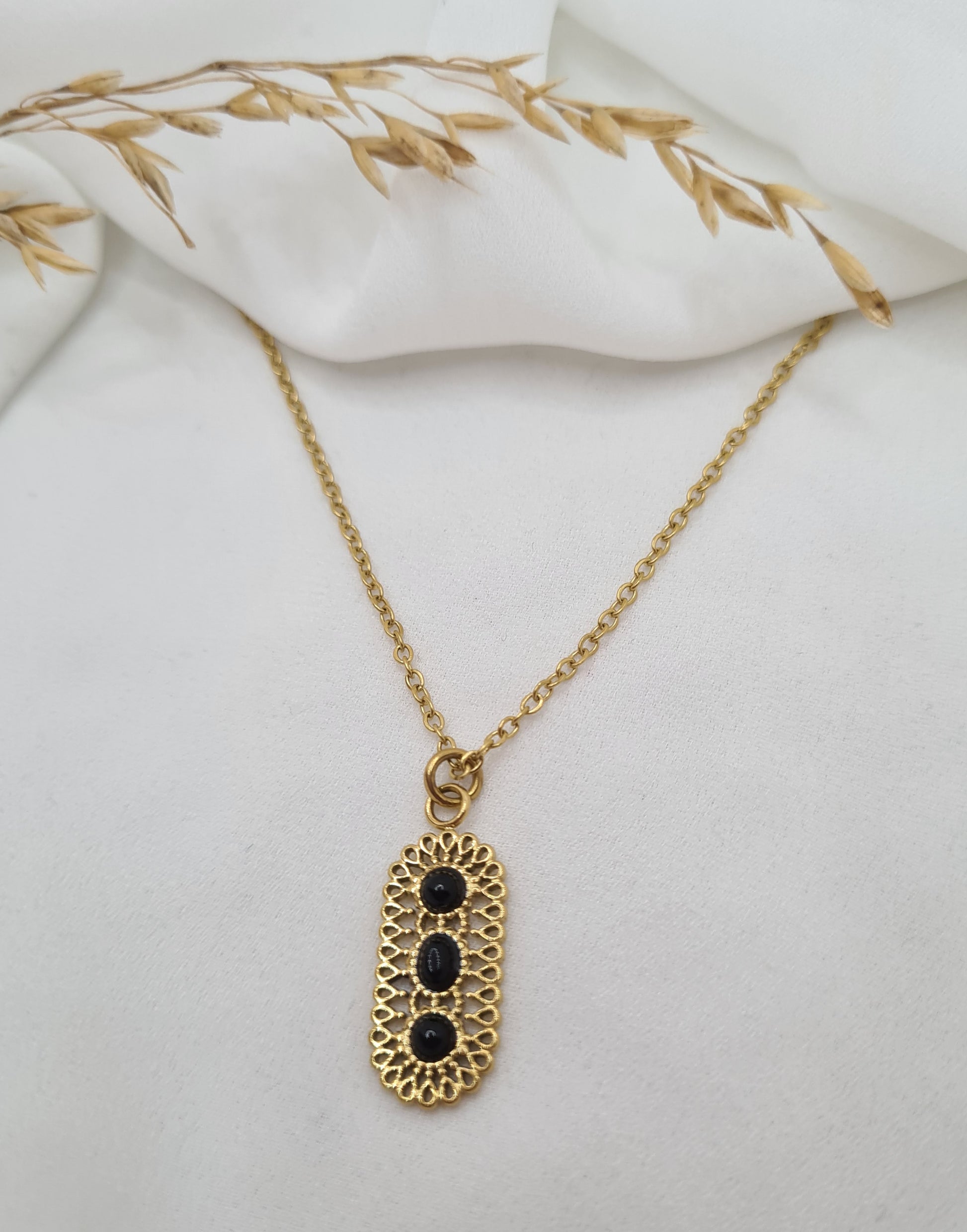 Magnifique sautoir en acier inoxydable et pierres naturelles d'onyx